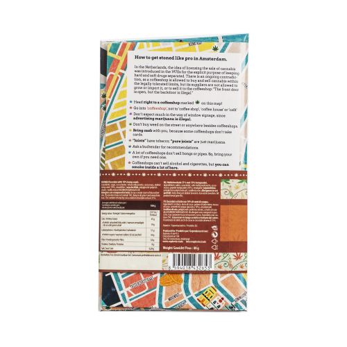 See piimašokolaad ei sisalda mitte ainult 32% kakaod ja 10% aromaatseid kanepiseemneid, vaid ka kaarti Amsterdami kohvikute asukohaga ja naljakaid näpunäiteid turistidele.